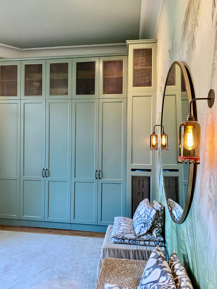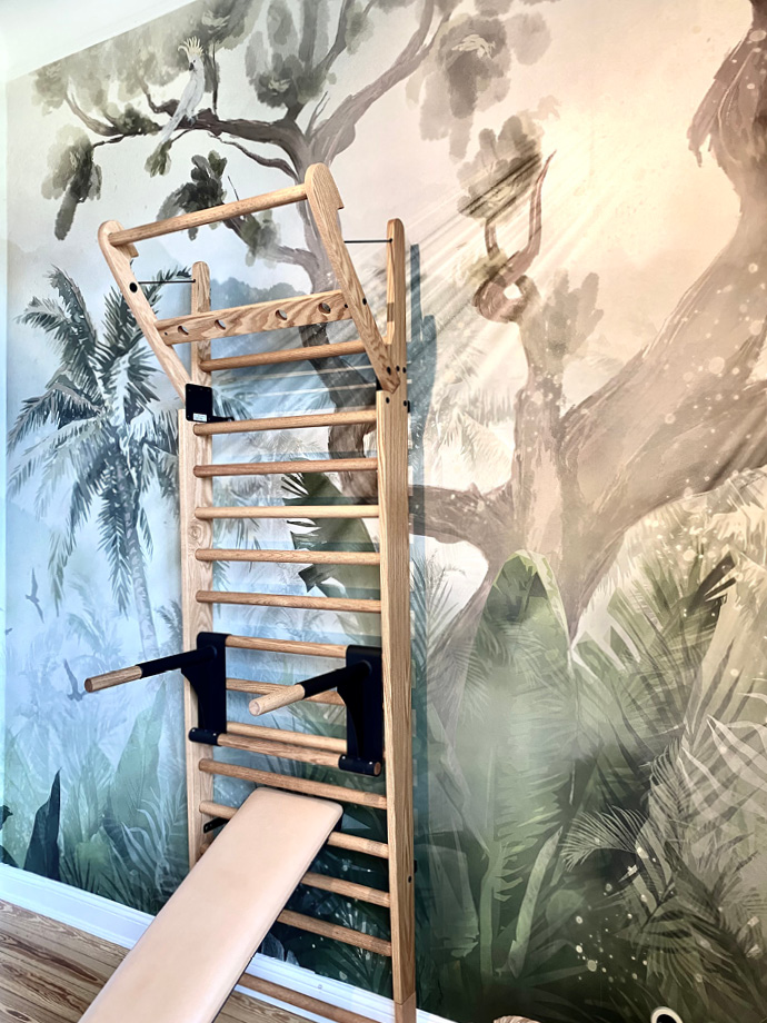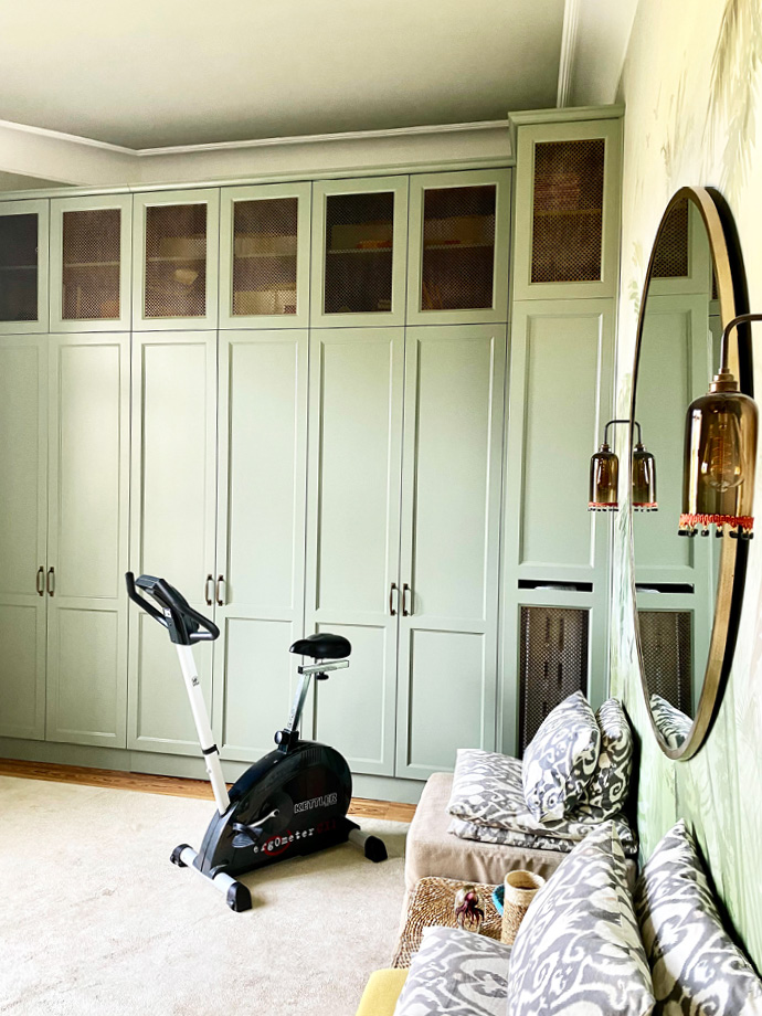 Mit hochwertigen Materialien wie brüniertem Messing, besonderen Leuchten von Curiousa aus England, ausgewählten Sportgeräten und einer aufwendigen Tischlerarbeit wurde ein einzigartiger Raum geschaffen – ein Ort, an dem die sportbegeisterte Familie sich wohlfühlt und gerne aktiv ist.