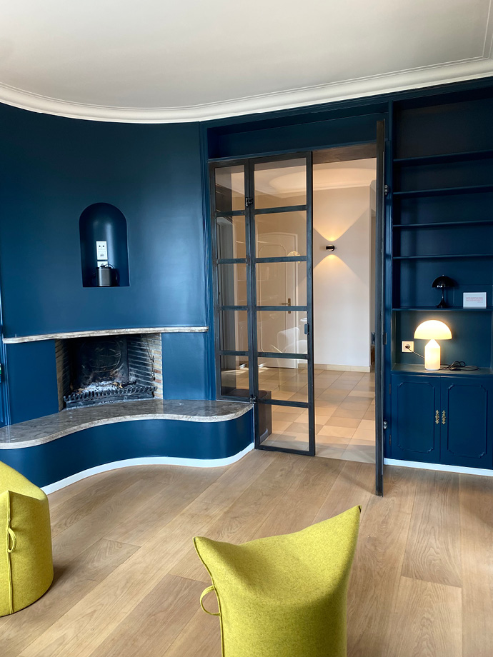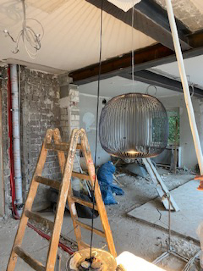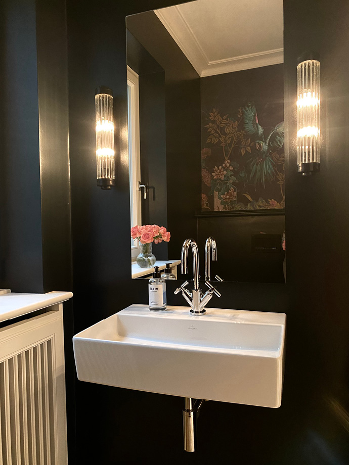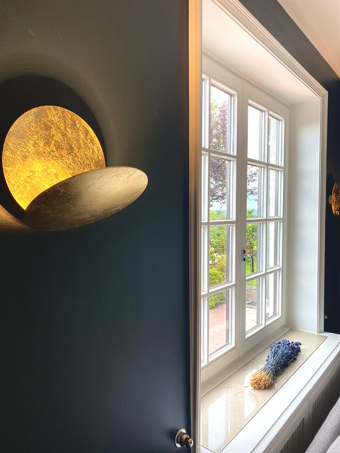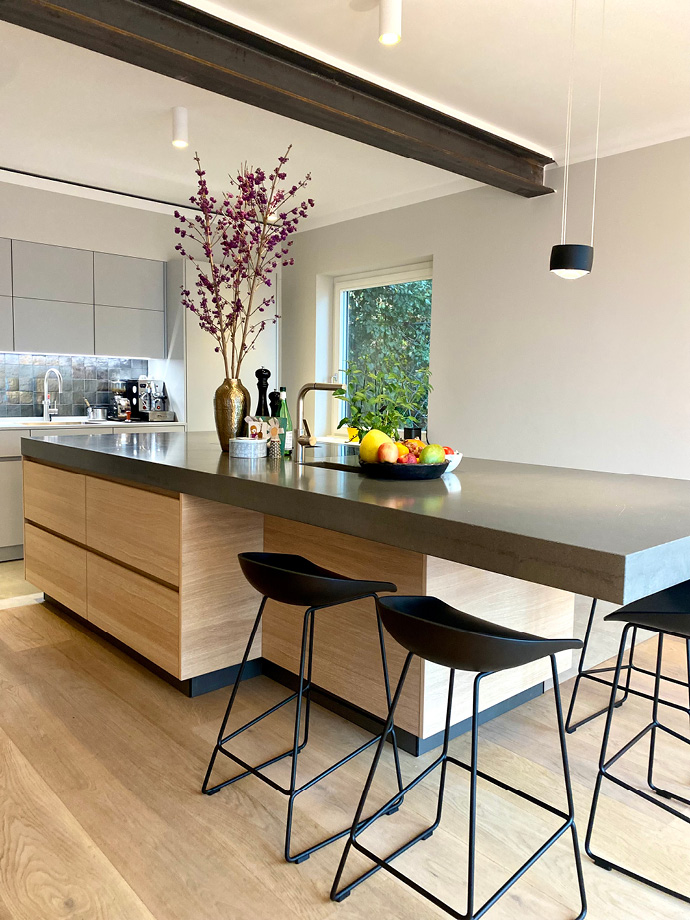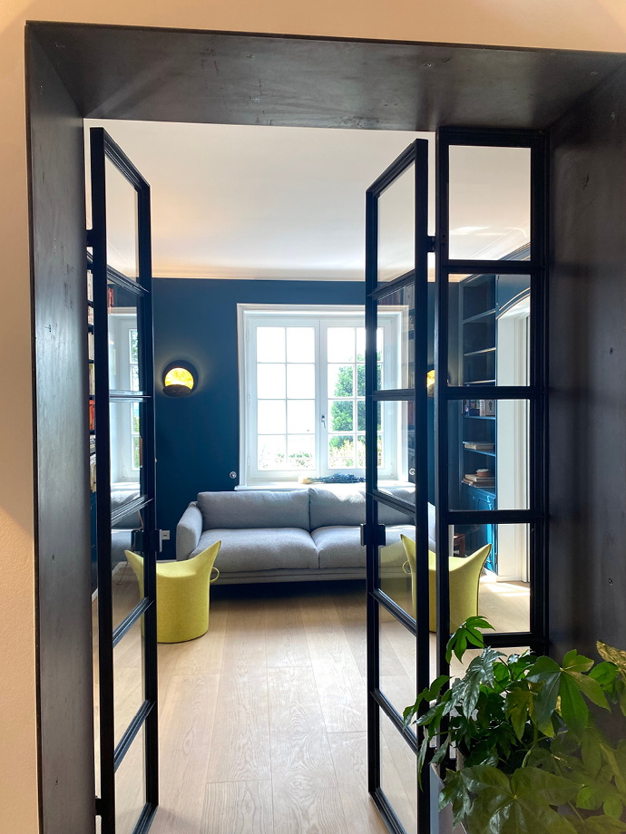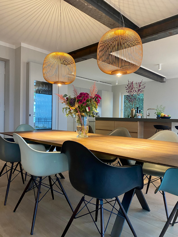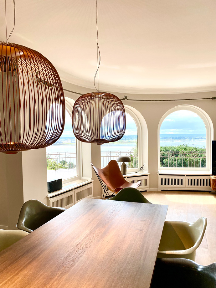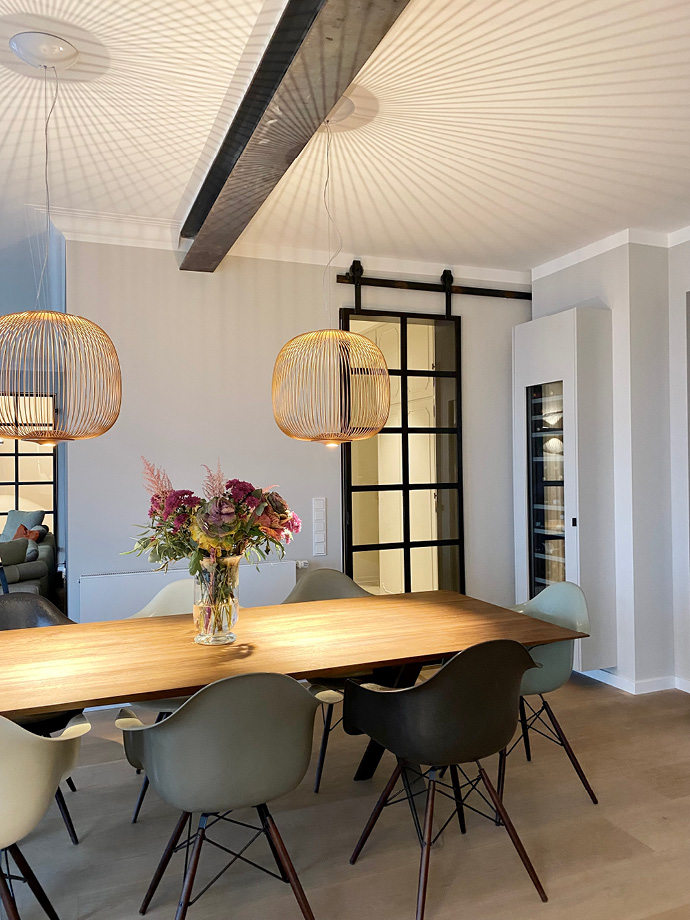 Die aufwendige Sanierung dieser ca. 300 Quadratmeter großen Villa hat das Haus in ein wahres Schmuckstück verwandelt. Um einen großzügigen Wohnbereich mit einer integrierten Küche zu schaffen, wurden Wände entfernt und Stahlträger eingezogen. Die dazu passenden neu eingesetzten Stahlglastüren verleihen dem Interieur eine moderne und individuelle Note. Warme Farben von Farrow & Ball, ausgewählte Leuchten von Foscarini, Catellani & Smith und Occhio sowie der gekalkte Eichenholzboden ergeben eine gelungene Komposition.