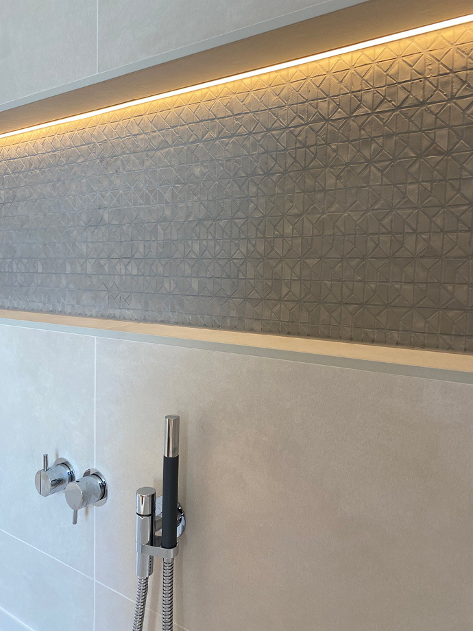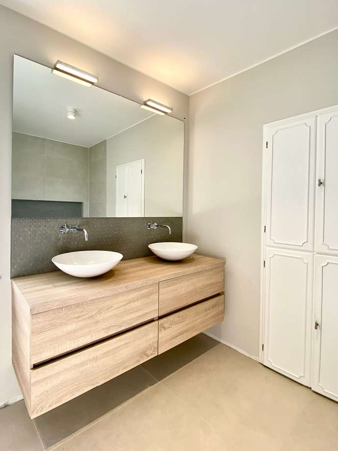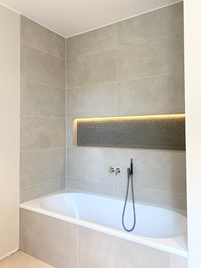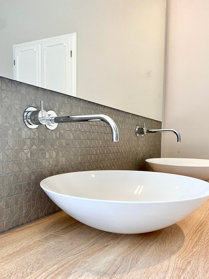Alle Bäder wurden vollständig erneuert und begeistern durch hochwertige Materialien. Edle Chrom-Armaturen von vola, Waschbecken von Alapé und dezent eingesetzte Mosaikfliesen verleihen ihnen eine zeitlose Eleganz.